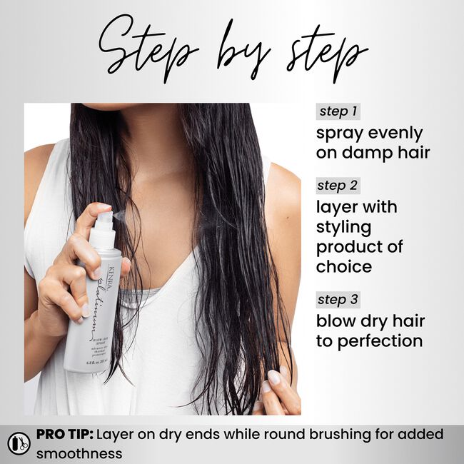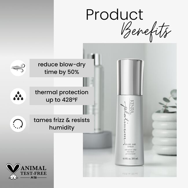 Kenra Platinum Blow-dry Spray, a revolutionary product that effectively transforms the blow-drying experience by reducing dry time by up to 50% while also adding thermal protection of up to 426 degrees Fahrenheit.